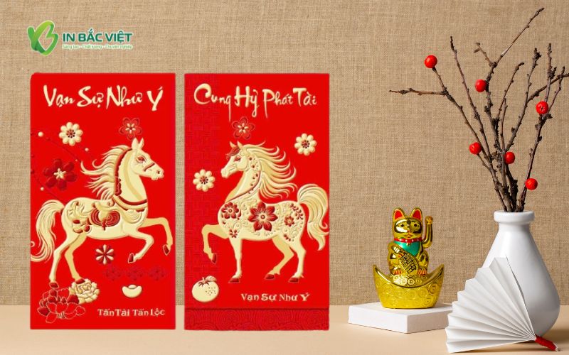 Nói đến mẫu bao lì xì Tết, hầu hết mọi người sẽ nghĩ ngay đến phong cách truyền thống với sắc đỏ, vàng và những họa tiết quen thuộc như hoa mai, hoa đào, đồng tiền vàng. Bên cạnh đó, còn có những mẫu bao lì xì dành riêng cho doanh nghiệp được thiết kế theo đặc thù ngành nghề, phong cách riêng. Đặc biệt, 2026 là năm Bính Ngọ nên hình ảnh chú ngựa mạnh mẽ, may mắn và tràn đầy sức sống sẽ xuất hiện nhiều trong các mẫu phong bao. Đồng thời cũng trở thành biểu tượng mang ý nghĩa chúc mừng đầu xuân.