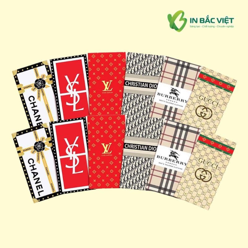 In Bắc Việt mang đến bộ sưu tập bao lì xì thời trang cao cấp, lấy cảm hứng từ các thương hiệu nổi tiếng thế giới như Dior, Gucci hay Louis Vuitton. Mỗi mẫu lì xì được thiết kế sáng tạo, in ấn chuyên nghiệp, thể hiện phong cách và đẳng cấp thương hiệu. Nếu bạn đang tìm kiếm mẫu bao lì xì cho các cửa hàng phân phối các thương hiệu thời trang trên hoặc phục vụ nhu cầu cá nhân thì hãy liên hệ ngay với chúng tôi để được tư vấn, báo giá miễn phí.