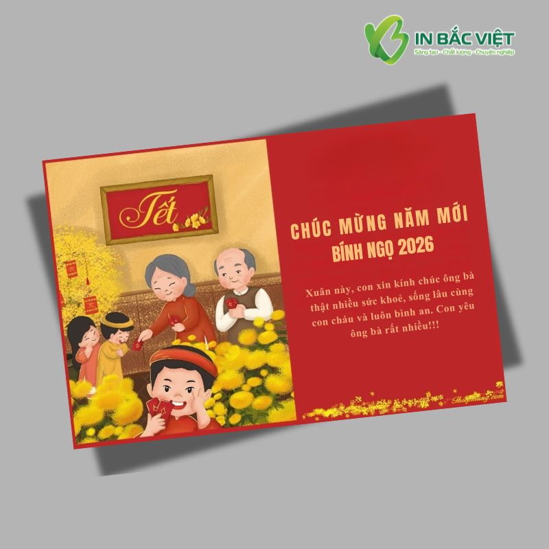 Tết đến nhà bao việc, bạn vẫn có thể dành chút thời gian để chuẩn bị một món quà nhỏ bé nhưng đầy ý nghĩa dành tặng người thân. Một tấm thiệp chúc Tết gia đình gửi tặng đến ông bà, bố mẹ, anh chị hay những người thân yêu; thể hiện tình cảm, sự chân thành của bạn dành cho người nhận. Để bạn không phải mất thời gian tìm kiếm ý tưởng, In Bắc Việt đã tổng hợp 39+ mẫu thiệp chúc Tết ông bà, bố mẹ, người thân ý nghĩa. Bạn hãy cùng tham khảo, lựa chọn mẫu thiệp ưng ý nhất để đặt in ấn, tặng người thân trong dịp Tết Bính Ngọ 2026 này nhé!
